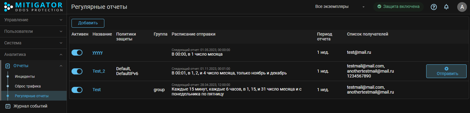 Периодичность отправки регулярных отчётов можно выбрать из предустановленных вариантов, либо задать собственные параметры периодичности в формате Cron. При необходимости можно выполнить отправку отчета адресатам немедленно.