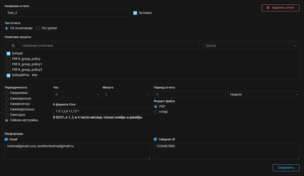 Отчет может отправляться по email или через Telegram. В «Настройках системы» должны быть заданы настройки почтового сервера и Telegram токен. Формат отчета – HTML или PDF.