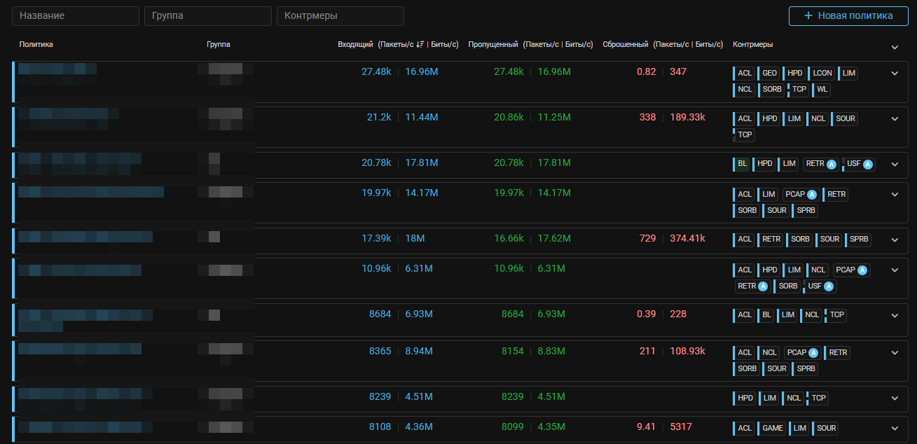 Добавлена возможность отсортировать политики защиты по возрастанию или убыванию объема входящего, пропущенного или сброшенного трафика в pps или bps.