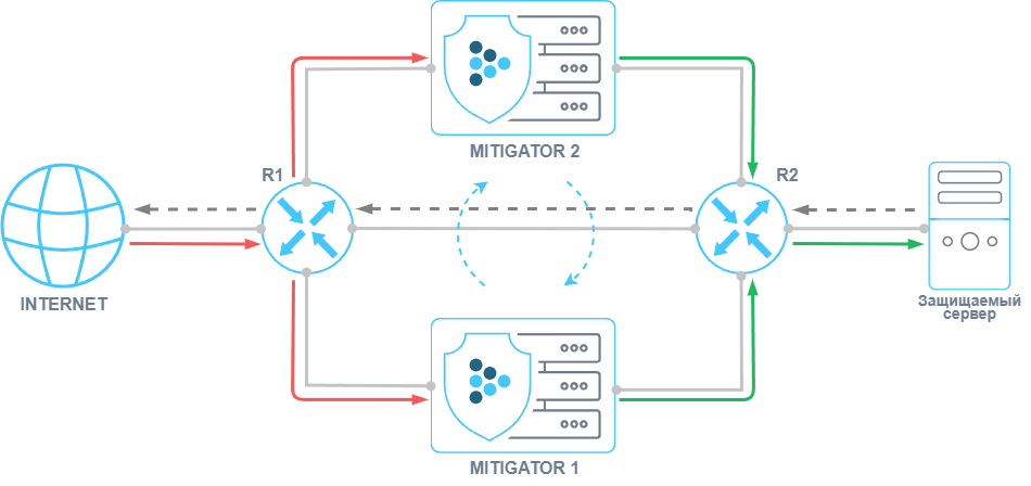 Контрмера SPLI — это единственная контрмера в MITIGATOR, требующая симметричного прохождения трафика. Однако, если включены active-standby и active-active синхронизации, можно организовать работу SPLI при асимметрии трафика, когда трафик клиента поступает на один экземпляр, а ответные пакеты от сервера приходят на другой.