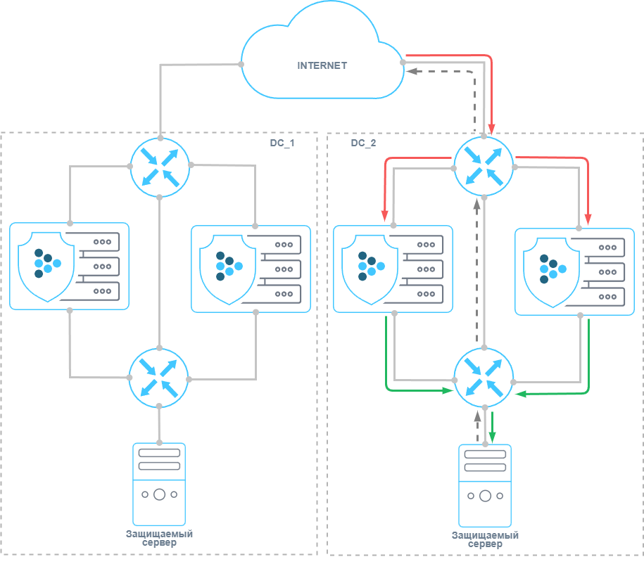 Допустим трафик защищаемого ресурса проходит через площадку DC_2, а DC_1 является резервной.