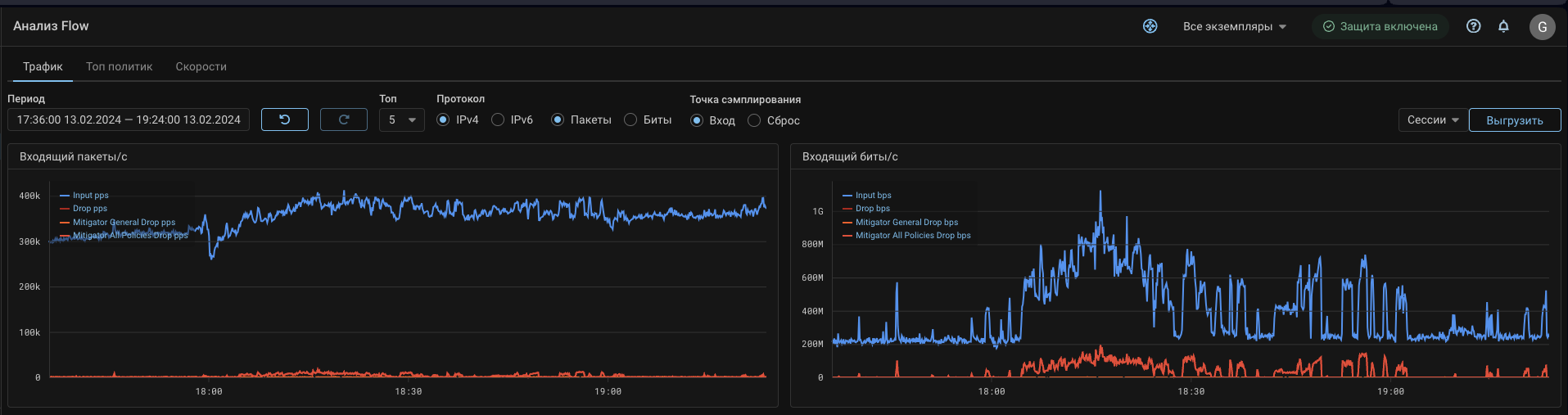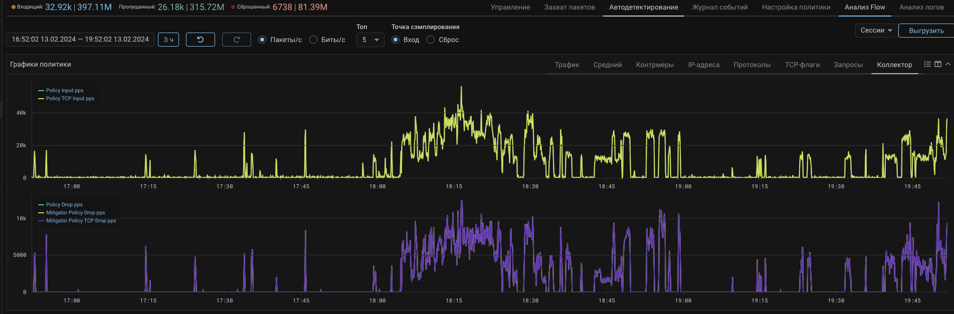 На вкладку «Коллектор» общего графика политики защиты и страницу «Анализ Flow» добавлены графики сбросов.