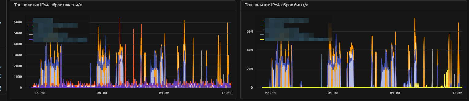 Аналогичные графики добавлены на вкладку «Топ политик». Также на графиках Топ политик IPv4 и Топ политик IPv6 отображаются графики суммарного сброса по наиболее нагруженным политикам.