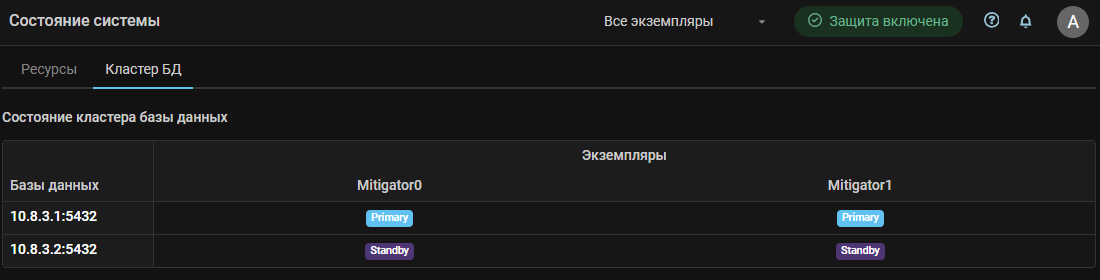 На страницу Состояние системы добавлена вкладка Кластер БД, на которой отображается информация о состоянии кластера баз данных. Для каждой базы отображается ее роль для каждого экземпляра MITIGATOR с активным pgfailover.