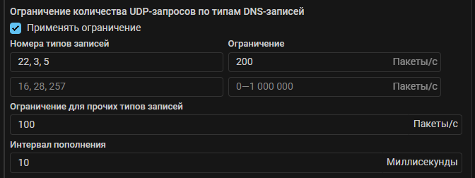 Добавлена возможность задавать ограничение на максимальное количество UDP-запросов с определенными номерами типов DNS-записей в секунду. Может быть задано множество ограничений. В каждом ограничении может быть указано несколько типов записей.