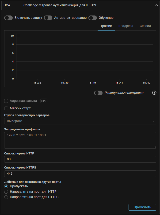 Для сценария обработки HTTP-трафика добавлена возможность задать проверяющему серверу отдельные порты для HTTP и HTTPS трафика. Запросы на указанные номера портов будут перенаправляться контрмерой HCA на соответствующие порты Web-challenger.
