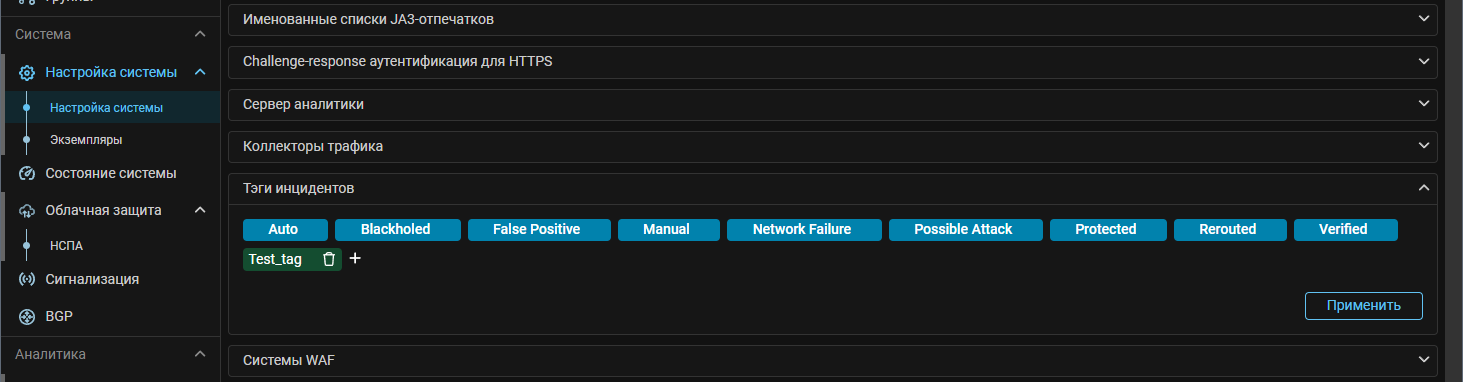На страницу «Настройка системы» добавлена карточка «Тэги инцидентов». Панель позволяет добавить, удалить или изменить тэги, используемые для маркировки инцидентов. Инциденту могут быть присвоены только тэги из перечня.