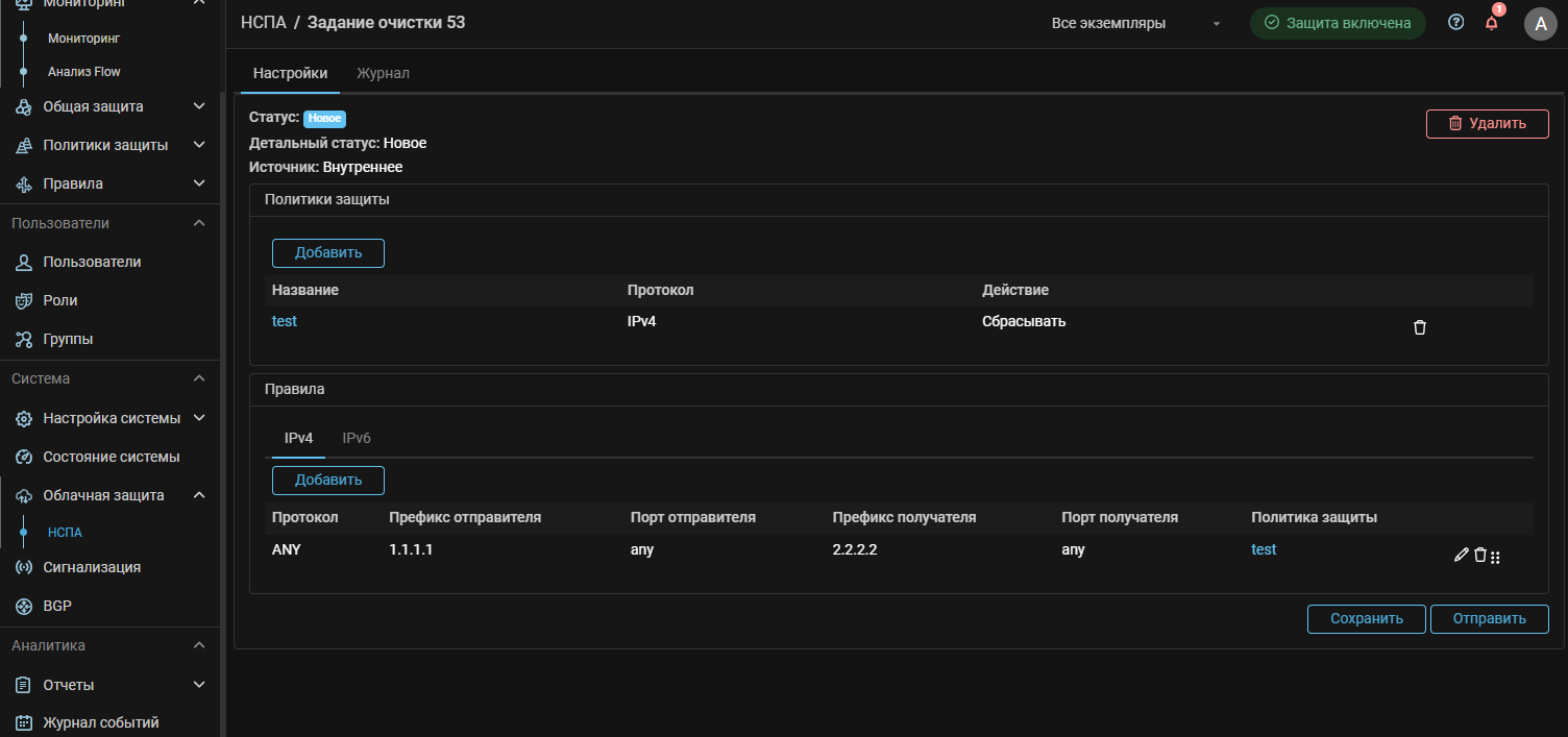 В рамках взаимодействия с НСПА можно отправлять правила фильтрации для своих защищаемых объектов в виде задания очистки, а также просматривать информацию об активных заданиях очистки и исторические данные. В списке отображаются все задания очистки, когда-либо запущенные для защищаемого объекта из любых систем.