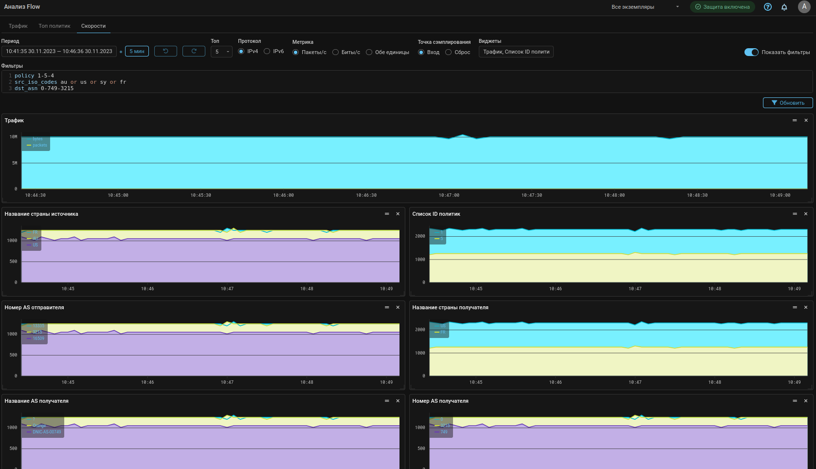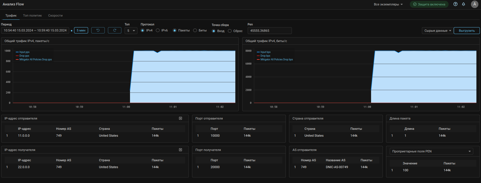 Теперь на странице Анализ Flow и на вкладке Анализ Flow в политике защиты можно получить статистику по топу значений поля PEN.