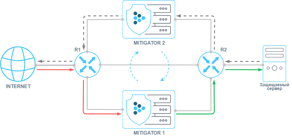 При переключении трафика на DC_1, и если контрмеры активны, может произойти разрыв ранее установленных соединений, так как в контрмерах MITIGATOR на DC_1 нет информации об аутентифицированных IP-адресах.