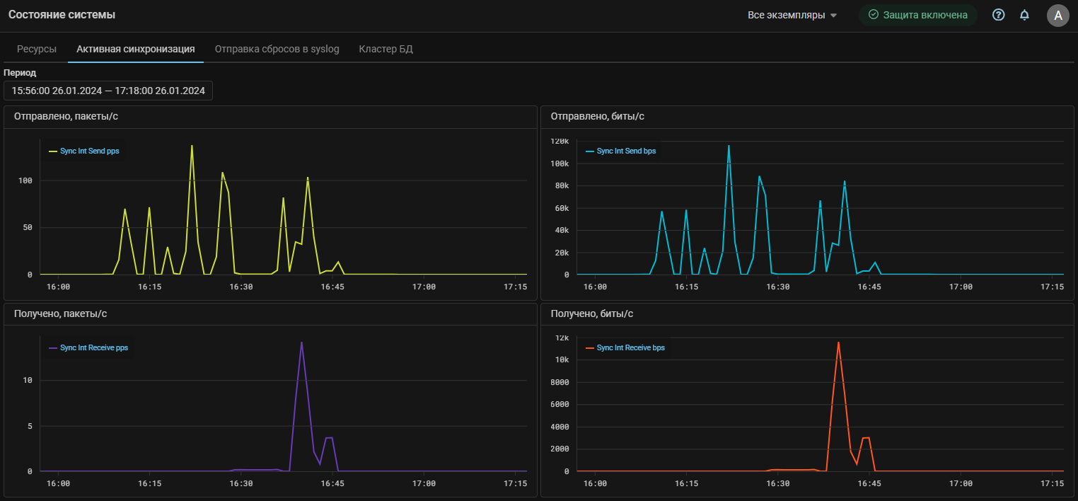 На страницу «Состояние системы» добавлена вкладка «Активная синхронизация». На вкладке отображаются графики трафика, возникающего между обработчиками пакетов во время работы активной синхронизации.