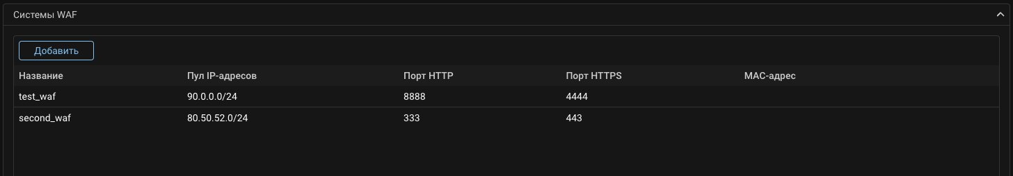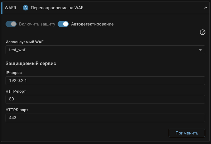 Трафик на указанные номера портов будут перенаправляться элементом WAFR на порты WAF указанные в настройках системы.