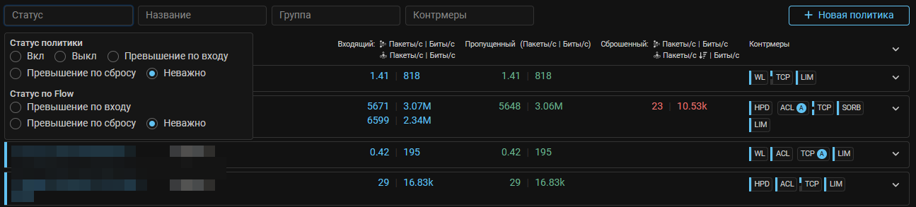 Добавлена фильтрация по статусу, позволяющая отобразить только политики защиты, в которых превышены пороги по входящему или сброшенному трафику, как по данным MITIGATOR, так и по данным Collector.