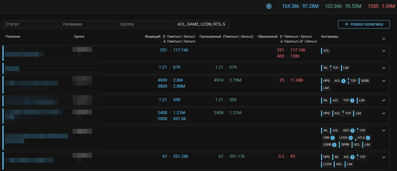 На странице списка политик защиты теперь отображаются скорости входящего и сброшенного трафика по данным Collector.