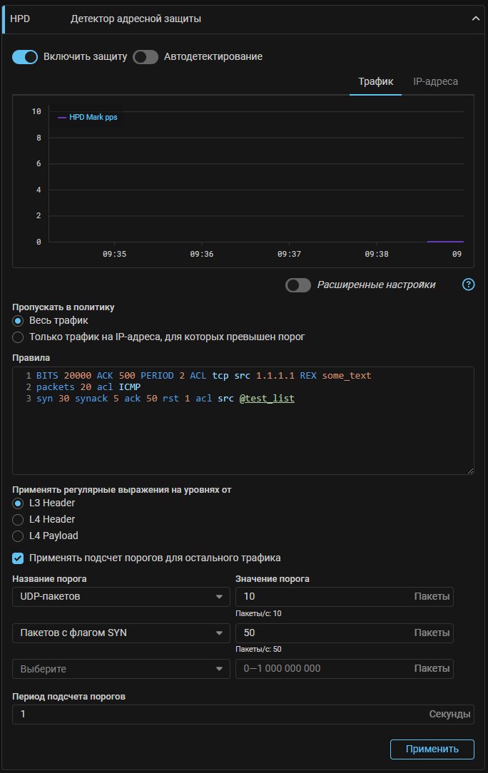 Теперь детектор адресной защиты подсчитывает сетевые пакеты, поступающие на каждый IP-адрес за период, согласно заданным правилам. Проверка пакетов на соответствие правилам происходит в порядке следования правил в списке. Правило может содержать порог и фильтр, состоящий из ACL и REX. Сначала проверяется соответствие трафика шаблону, и только после этого соответствующий шаблону трафик подсчитывается правилом.