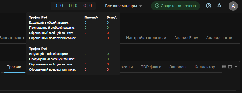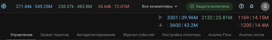 Теперь в правом углу верхней панели отображаются скорости входящего, пропущенного и сброшенного трафика по данным обработчика пакетов и скорости входящего и сброшенного трафика по данным Collector.