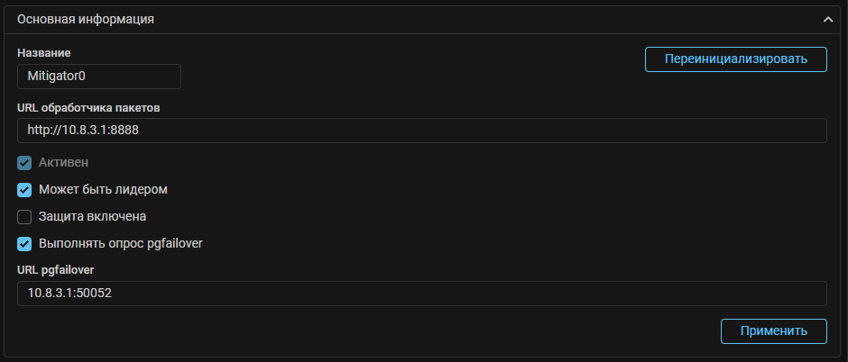 В настройки экземпляра добавлена кнопка, которая перезагружает на обработчик пакетов все настройки из «Primary» базы данных. Следует применять для синхронизации настроек обработчика пакетов в случае, когда выполнено восстановление кластера после распада.
