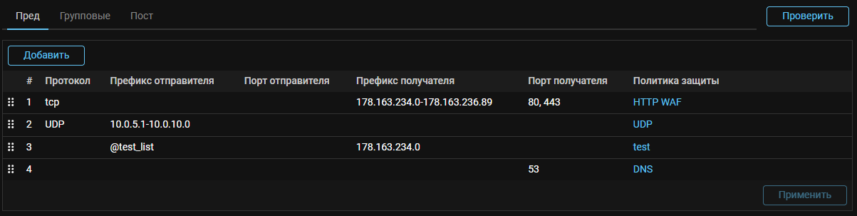Теперь в префиксах отправителя или получателя в правилах маршрутизации на политики защиты