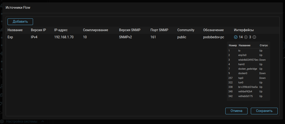Теперь коллектор может опрашивать интерфейсы экспортеров Flow и отображать в Web-интерфейсе их названия, номера и статусы.