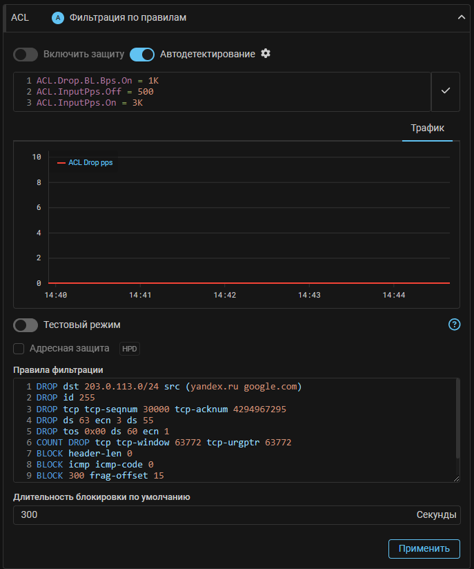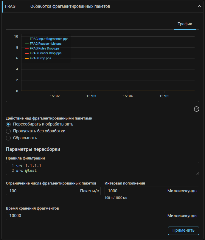 Теперь пересборка может применяться не ко всем поступающим пакетам, а только к тем, что соответствуют заданным правилам. Все прочие пакеты будут сброшены. Это позволяет обрабатывать только легитимный фрагментированный трафик, если он есть в защищаемой сети. Синтаксис правил аналогичен контрмере ACL, но не содержит действия над трафиком. L4 header содержится только в первом фрагменте, это стоит учитывать при написании правил.