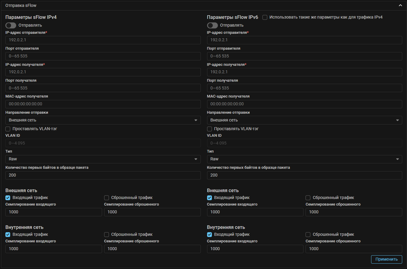 Теперь настройки отправки sFlow для IPv4 и IPv6 отображаются на одной вкладке. Также добавлена возможность применять единые настройки отправки sFlow независимо от версии протокола IP, аналогично отправке информации о сбросах в syslog.