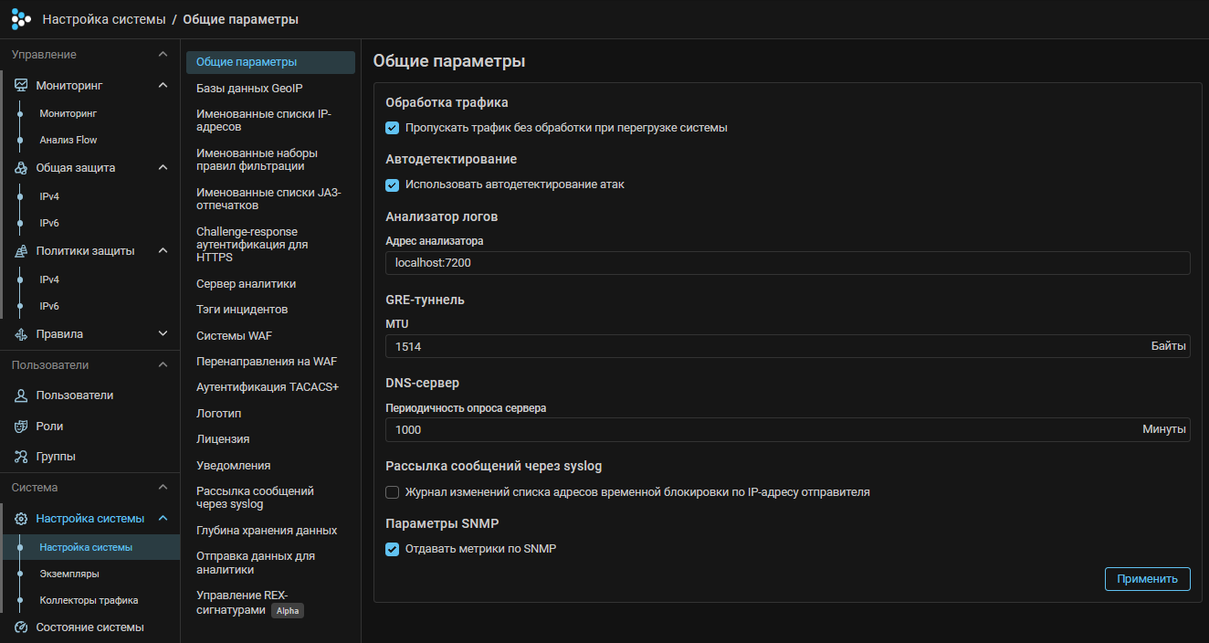 Теперь MITIGATOR может отдавать ряд метрик по SNMP. Для работы механизма требуется включить отправку в карточке «Общие параметры» страницы «Настройка системы».