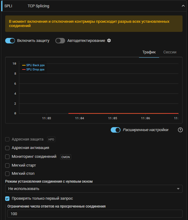 Теперь просроченные соединения, установленные с IP-адреса в режиме проверки по первой сессии закрываются отправкой RST+ACK. Отправку таких пакетов можно ограничить.