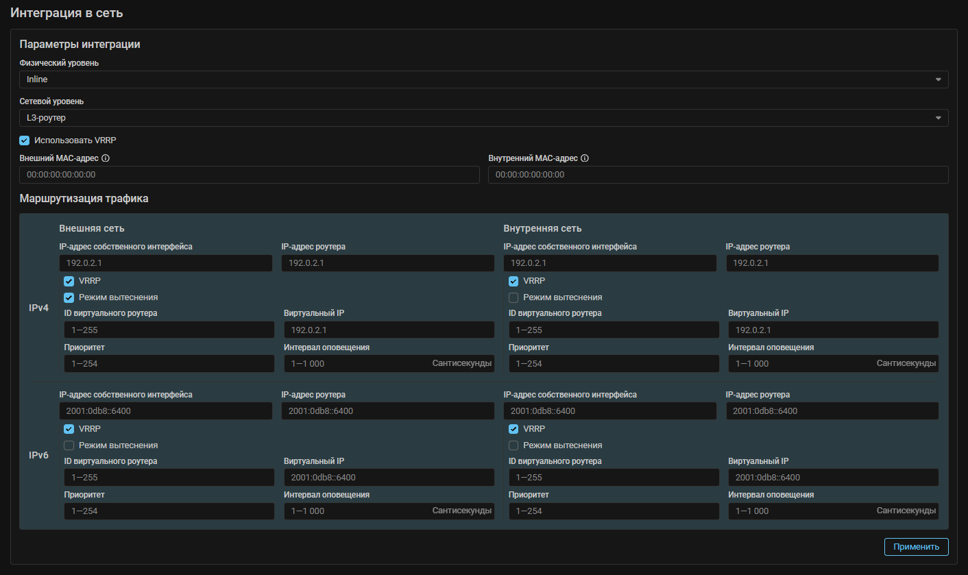 В режиме работы L3-роутер реализована поддержка VRRP для всех режимов подключения на физическом уровне:
