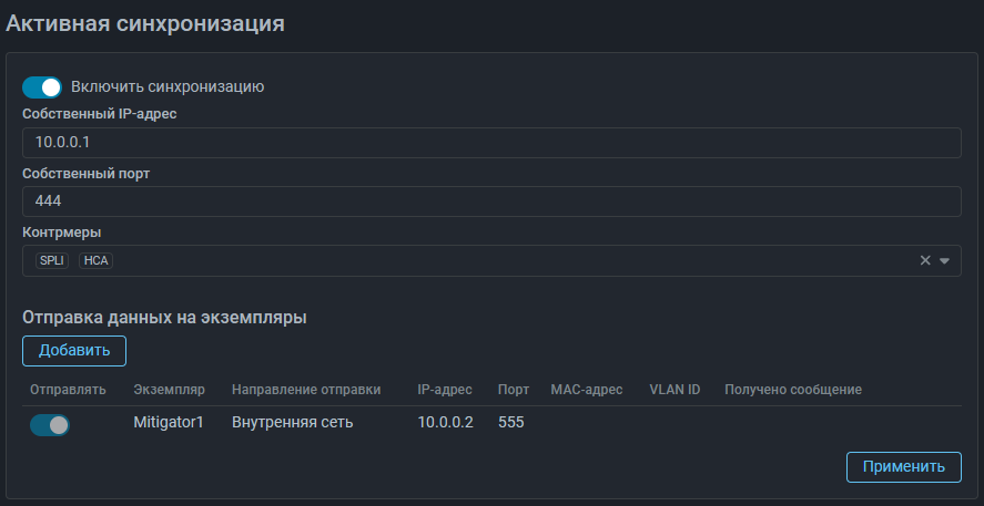 Теперь в настройках активной синхронизации можно указать, данные каких контрмер следует синхронизировать между обработчиками пакетов.