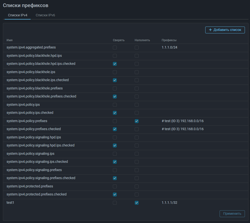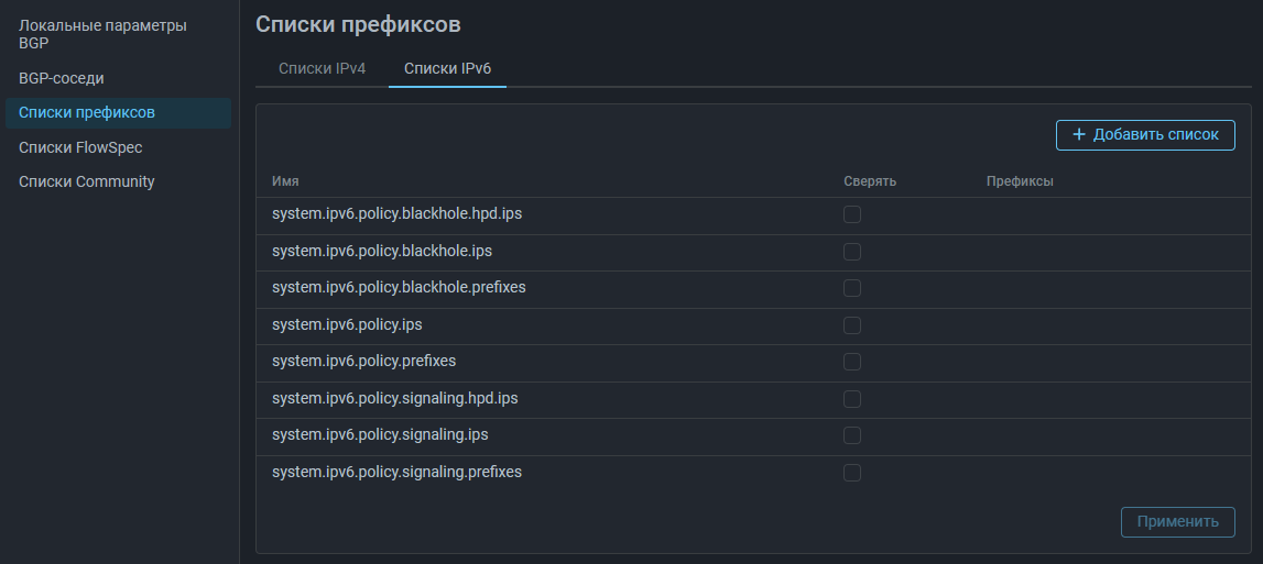 Списки префиксов и flowspec-правил для IPv4 и IPv6 вынесены на отдельные вкладки. Изменены названия всех списков. Теперь в названии указывается принадлежность к версии IP.