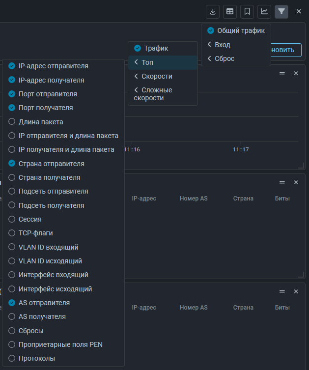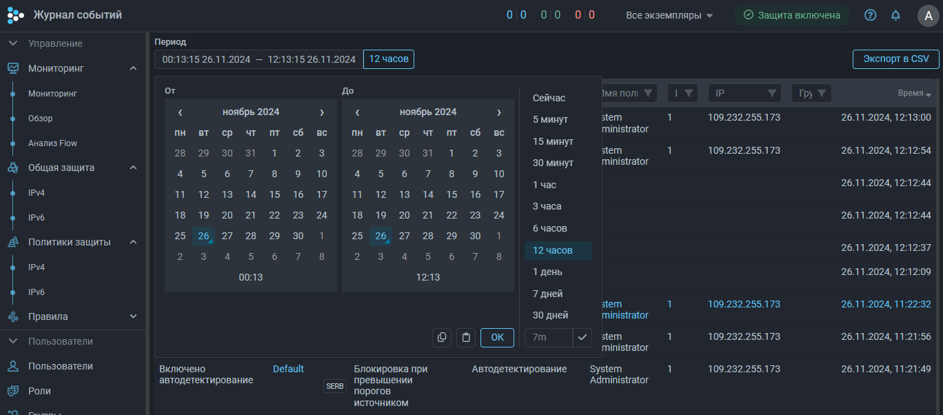 В фильтре Дашборда на странице «Анализ Flow» и на вкладке «Анализ Flow» в политике защиты добавлена кнопка, позволяющая переключаться между ранее введенными фильтрами.
