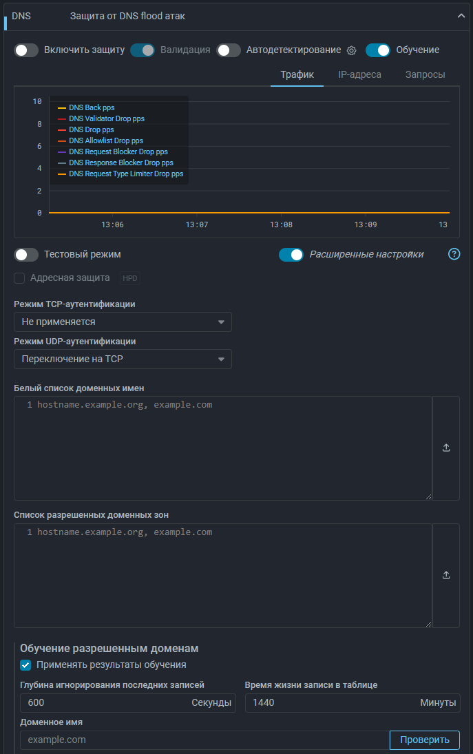 Добавлен режим обучения. Если обучение включено, то контрмера запоминает, на какие доменные имена поступали DNS-запросы до начала атаки. В результате будет автоматически сформирован аналог списка разрешенных доменов. Обучение может работать даже когда сама контрмера выключена.