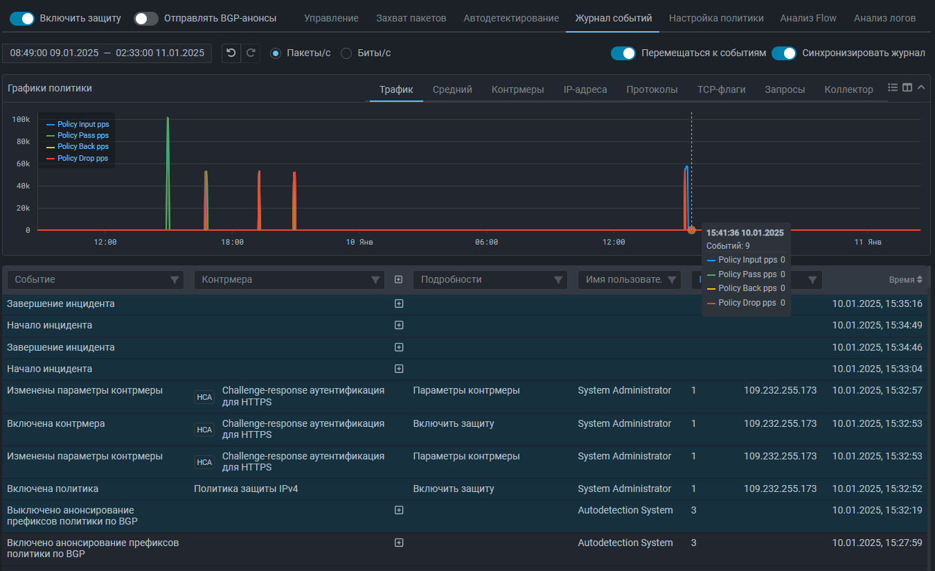 Если активирован переключатель «Перемещаться к событиям» в журнале событий политики защиты, то при наведении курсора на график политики будет осуществляться переход к событиям, произошедшим в указанное на графике время.