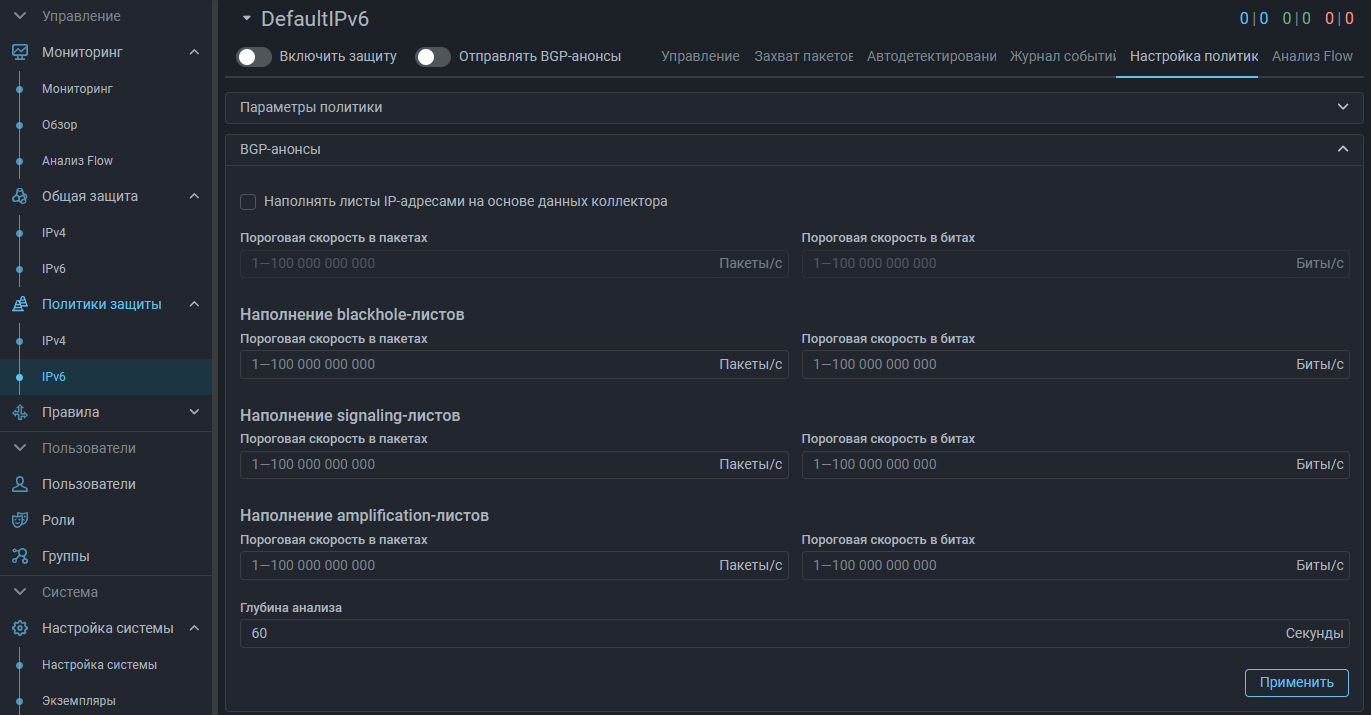 На страницу политики IPv6 добавлены элементы управления BGP-анонсированием: переключатель «Отправлять BGP-анонсы», управление пороговыми значениями для blackhole и signaling, пороги автодетектирования и прочее, аналогично странице политики IPv4.