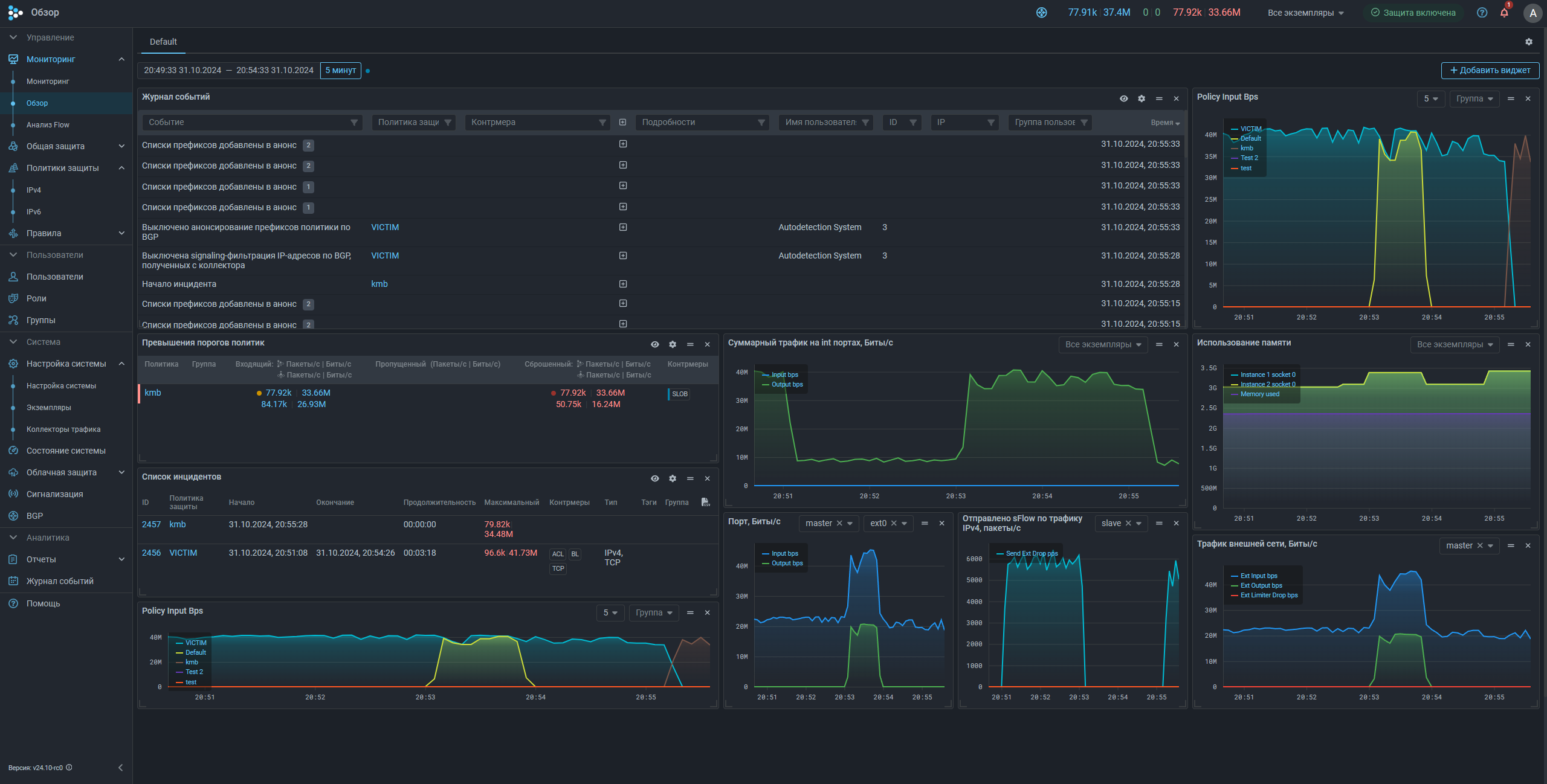 В раздел главного меню «Мониторинг» добавлена страница «Обзор». Страница внешне похожа на «Анализ Flow», и позволяет настроить одновременное отображение данных из различных разделов web-интерфейса, сведенных в один или несколько дашбордов. Каждый дашборд задается на отдельной вкладке. Название вкладки может быть изменено, чтобы отражать состав отображаемых данных. Для каждой вкладки может быть задано произвольное количество виджетов с данными, определен их размер и положение на экране. Переключение между вкладками позволяет быстро переключаться между несколькими наборами виджетов для решения различных задач.