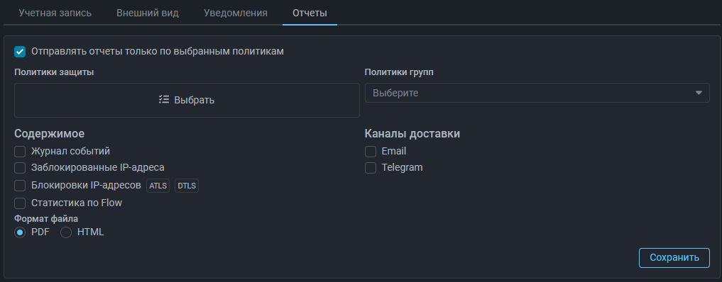 На странице «Пользователь» добавлена вкладка «Отчеты», на которой можно задать параметры автоматической отправки отчета об инциденте при его завершении.