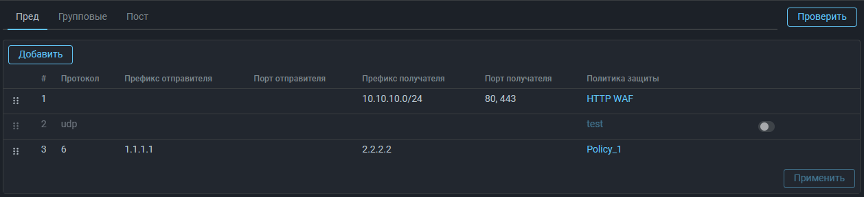 Теперь на странице списка политик защиты можно единовременно применить одинаковое действие сразу к нескольким выбранным политикам защиты. На данный момент поддерживаются действия включения и отключения отдельных контрмер, а также добавление порогов автодетектирования.