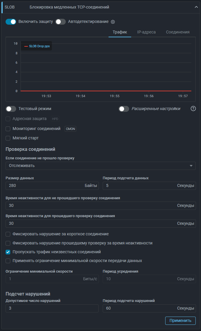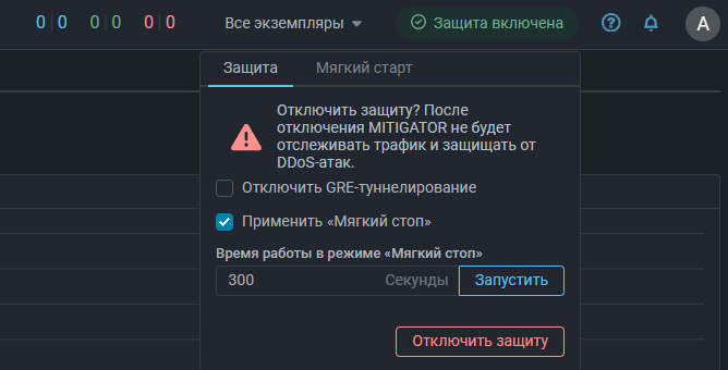 Теперь, если во множестве политик защиты используется SPLI, перед снятием трафика с MITIGATOR можно активировать глобальный «Мягкий стоп», чтобы не разрывать активные сессии. «Мягкий стоп» будет включен в SPLI всех политик, в которых проставлен одноименный чекбокс.