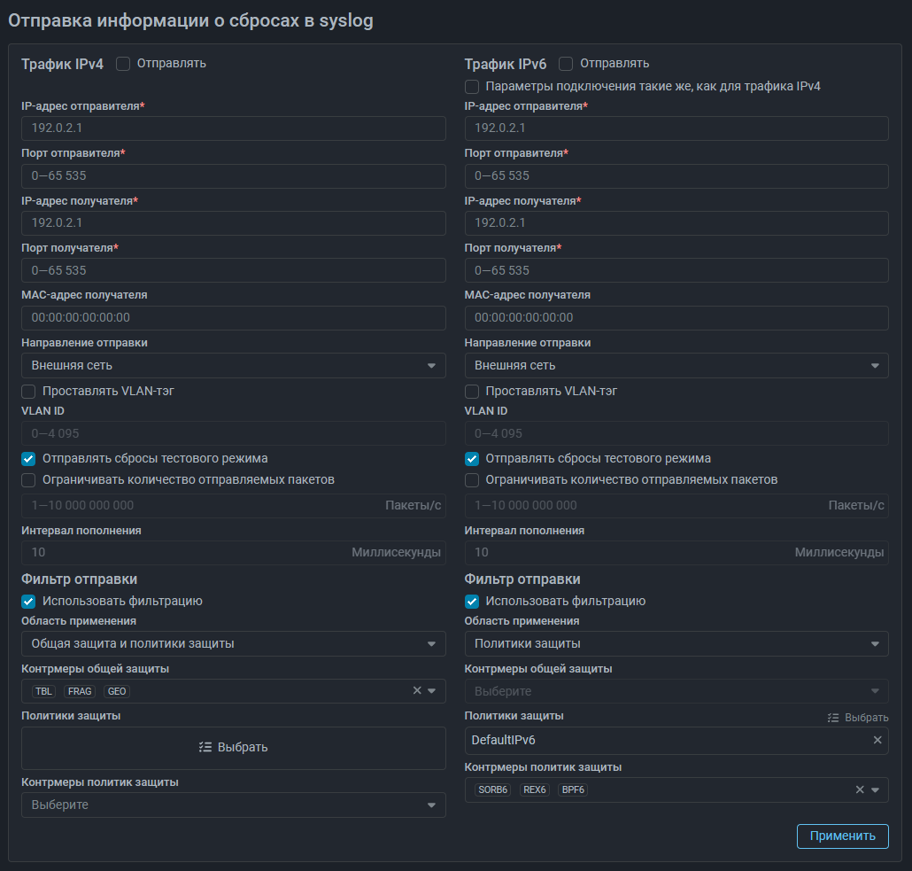 Syslog. Добавлена возможность выбора политик и контрмер, по сбросам в которых требуется отправлять syslog-сообщения.