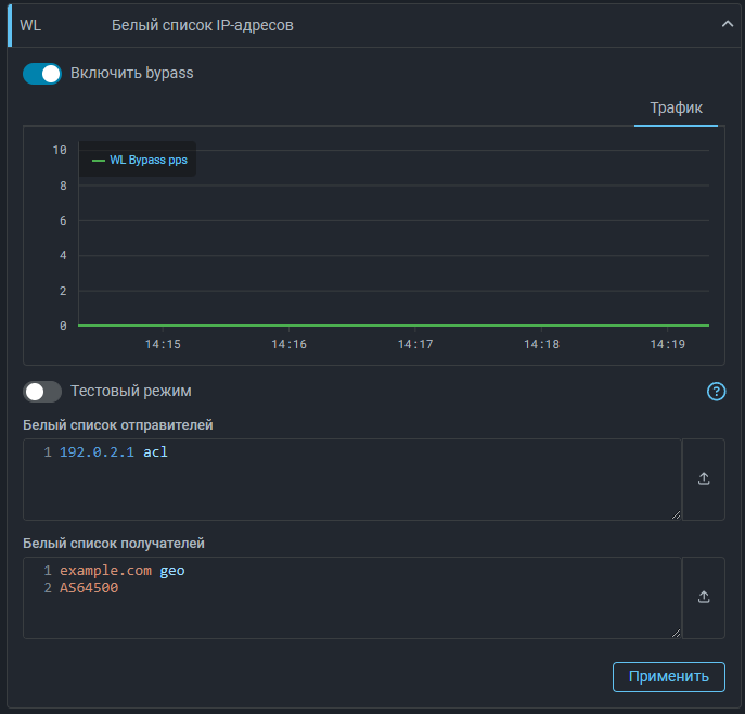 Теперь WL в общей защите и политике может пропускать без обработки последующими контрмерами не только трафик с указанных src IP, но и на указанные dst IP.