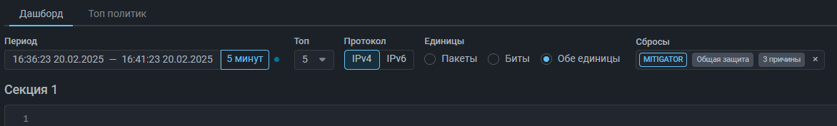 Кнопки для выбора версии протокола IP приведены к тому же виду, что и на вкладке «Топ политик» страницы «Мониторинг». Для групп элементов управления добавлены заголовки.