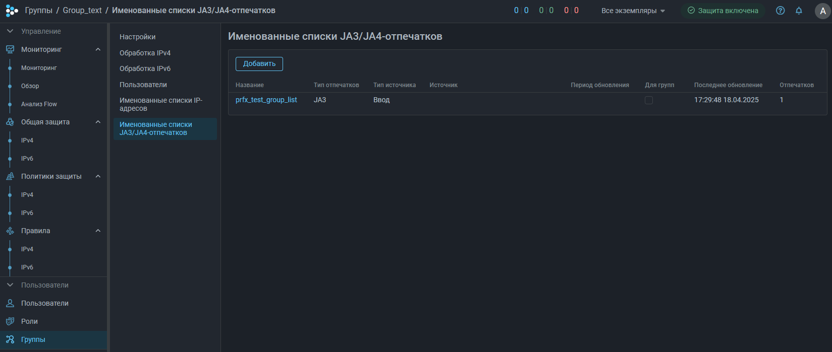 Теперь на странице «Группа» в пункте подменю «Именованные списки JA3/JA4-отпечатков» групповые пользователи могут создавать именованные списки отпечатков и самостоятельно управлять их содержимым.