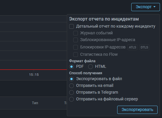 Теперь при нажатии кнопки «Экспорт» для получения отчета по инцидентам можно выбрать способ получения: