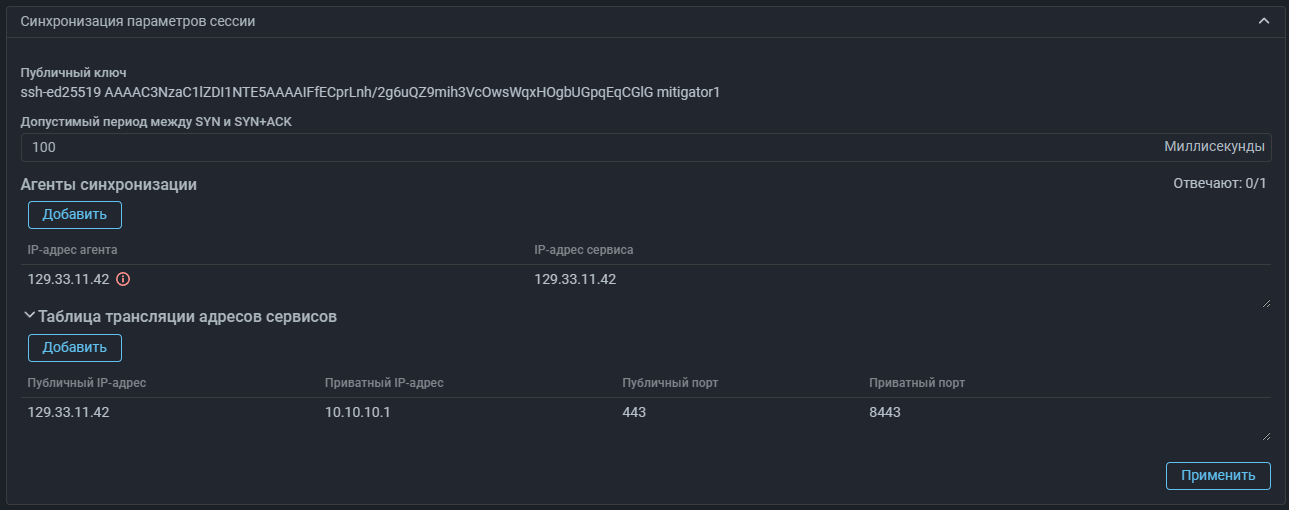 Ранее в сценариях защиты с использованием синхронизации параметров сессий возникали проблемы при нахождения защищаемого сервера за NAT. В карточке «Синхронизация параметров сессии» в таблице трансляции теперь можно сопоставить публичные и локальные IP-адреса и порты защищаемых сервисов.