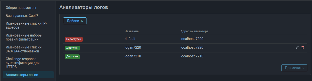 Теперь MITIGATOR может работать с несколькими LOGAN одновременно. Настройки LOGAN вынесены в отдельный пункт настроек системы «Анализаторы логов».