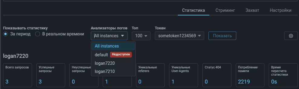 Теперь на вкладке «Статистика» в «Анализе логов» автоматически выбирается первый токен из списка.