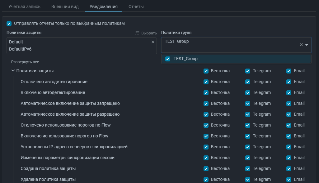 Теперь при настройке уведомлений о событиях на странице пользователя можно выбрать группу. В этом случае пользователь будет получать уведомления только о событиях в политиках защиты, принадлежащих этой группе.