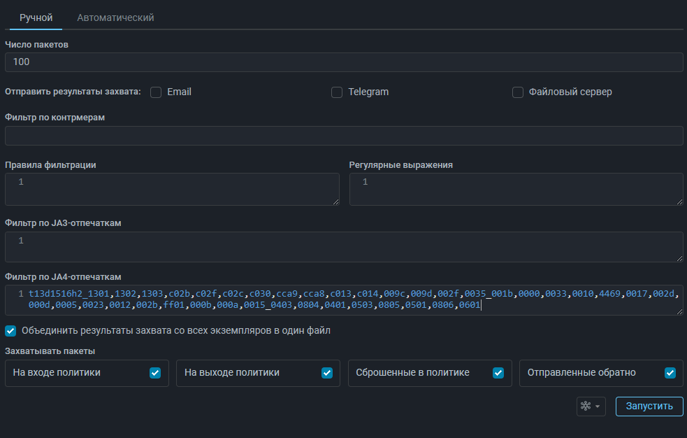 Теперь в захвате пакетов для общей защиты и политики можно задать фильтр по JA4-отпечатку.