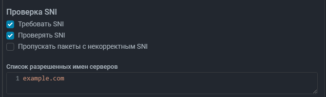 Добавлен механизм проверки и фильтрации содержимого расширения SNI. Выполняются проверки на соответствие содержимого SNI требованиям RFC 6066 и списку разрешенных доменных имен, если он задан.