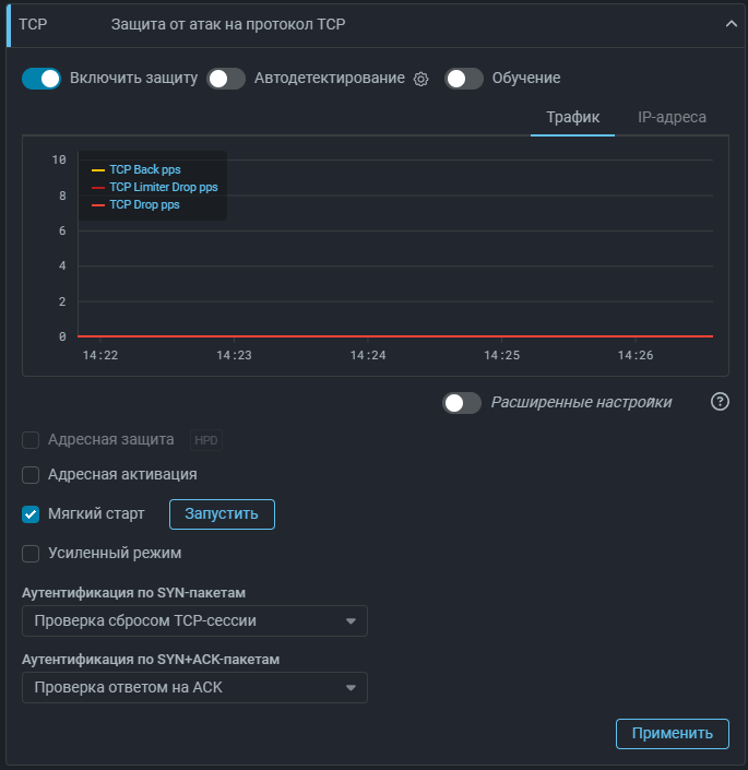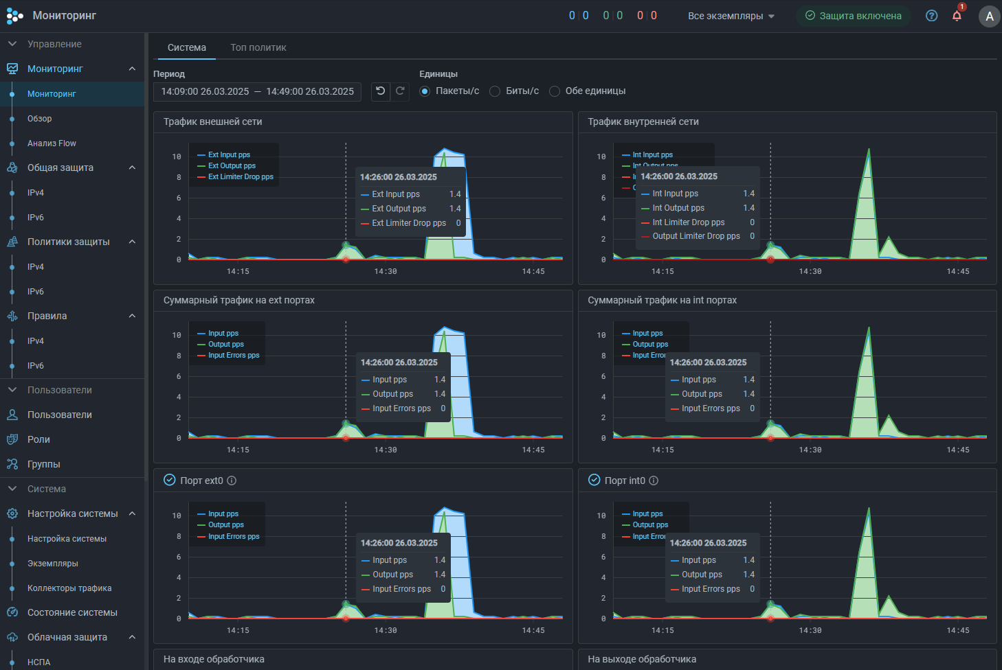 В политике защиты policy_1 задан порог ACL.Drop.ACL.Pps.On = 50.